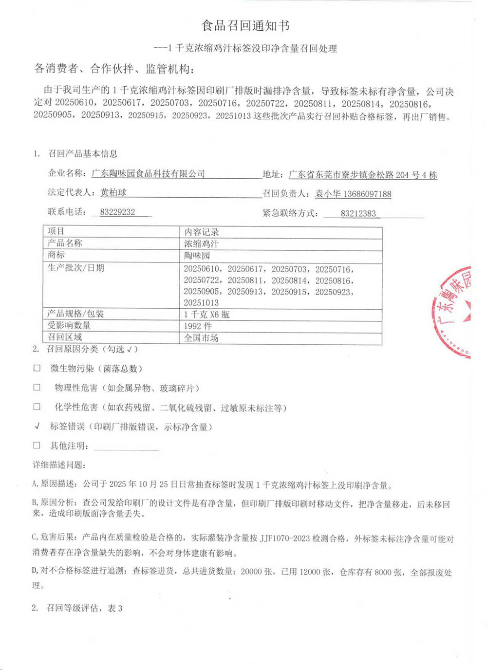 食品召回通知書